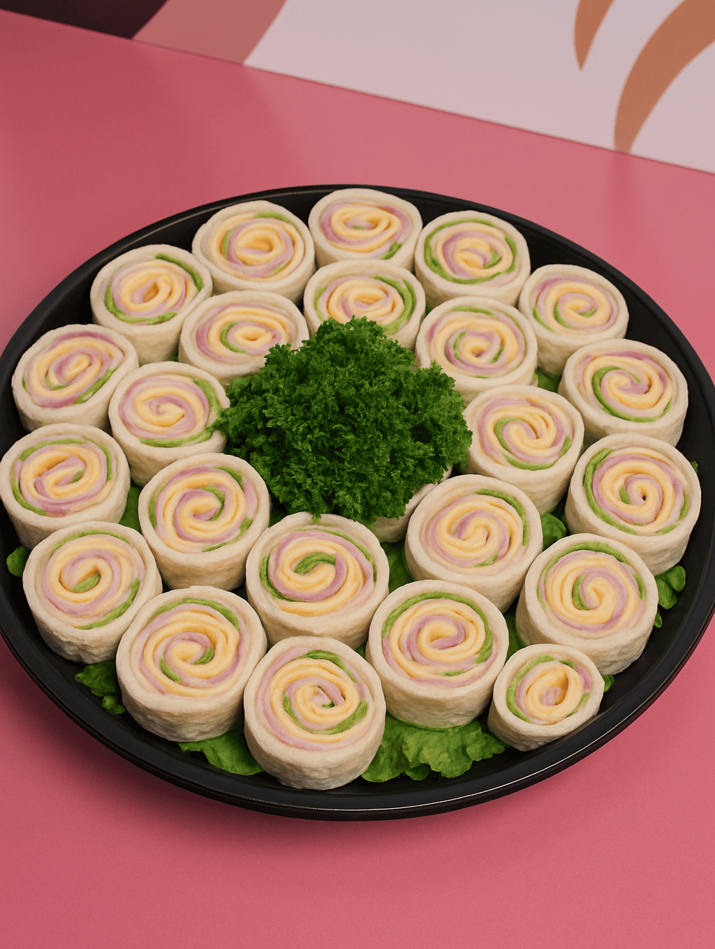 This appetizers is made with flour tortillas, ham, cheese and lettuces.